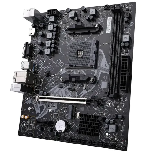 The Colorful BATTLE-AX B450M-K M.2 V14 AM4 mATX motherboard is designed for consumers who desire reliable features, broad compatibility, and strong performance in a small micro-ATX package. Supporting AMD Ryzen series processors via the AM4 socket, it provides a solid basis for gaming rigs, productivity settings, and daily computers. Memory performance is impressive, with two DDR4 sockets enabling up to 64GB total capacity, or 32GB each slot, and speeds up to DDR4-4000 (OC). The Colorful BATTLE-AX B450M-K M.2 V14 Motherboard optimizes memory settings for steady, high-performance operation thanks to its dual-channel architecture and support for Extreme Memory Profile (XMP). Storage options are equally diverse, with one M.2 slot supporting 2242/2280 SSDs via PCIe 3.0 x4 or SATA and four SATA 6Gb/s connectors for extra drives. The board’s back I/O contains two USB 2.0 ports, four USB 3.2 Gen 1 Type-A connectors, HDMI 2.0 support for 4K @ 60Hz, VGA, PS/2, Gigabit LAN, and three audio jacks. The colorful BATTLE-AX B450M-K M.2 V14 Motherboard includes internal headers for expansion of more USB ports, audio, fans, and front panel connectors, as well as debug and jumper pins for expert users. Expansion slots include one PCIe 3.0 x16 slot for graphics cards and one PCIe 2.0 x1 slot for add-on cards. The motherboard includes a 128M UEFI BIOS that supports several languages, as well as advanced power management features such as S3/S4 wake-up, network S5 wake-up, USB wake-up, and scheduled boot choices. The colorful BATTLE-AX B450M-K M.2 V14 Motherboard includes monitoring tools that let you to regulate CPU and system fan speeds, as well as track CPU, system, and voltage temperatures in real time. The dependable RTL8111H Gigabit Ethernet controller handles networking, while the Realtek ALC897 codec provides high-fidelity audio up to 5.1 channels. This colorful BATTLE-AX B450M-K M.2 V14 mATX Motherboard is 230mm x 197mm and fits comfortably into tiny enclosures without sacrificing connectivity or performance.