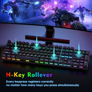 The T-Wolf T17 Wired RGB Mechanical Gaming Keyboard is a top choice for gamers and professionals seeking a high-performance, durable, and visually appealing keyboard. Featuring 104 keys with Blue mechanical switches, it delivers precise, tactile feedback and a satisfying click sound, perfect for fast-paced gaming and typing. The keyboard’s customizable RGB backlighting offers multiple dynamic lighting effects, allowing users to personalize their setup and enhance their gaming environment. Built with double-shot ABS keycaps, the T-Wolf T17 ensures long-lasting durability and resistance to wear and fading. Its ergonomic design and non-slip base provide comfort and stability during extended use. The reliable wired USB connection guarantees consistent performance without input lag, and the keyboard is compatible with various operating systems, requiring no additional drivers for a seamless plug-and-play experience. Combining functionality, durability, and aesthetic appeal, the T-Wolf T17 Wired RGB Mechanical Gaming Keyboard is an excellent choice for anyone looking to upgrade their gaming or professional setup.
