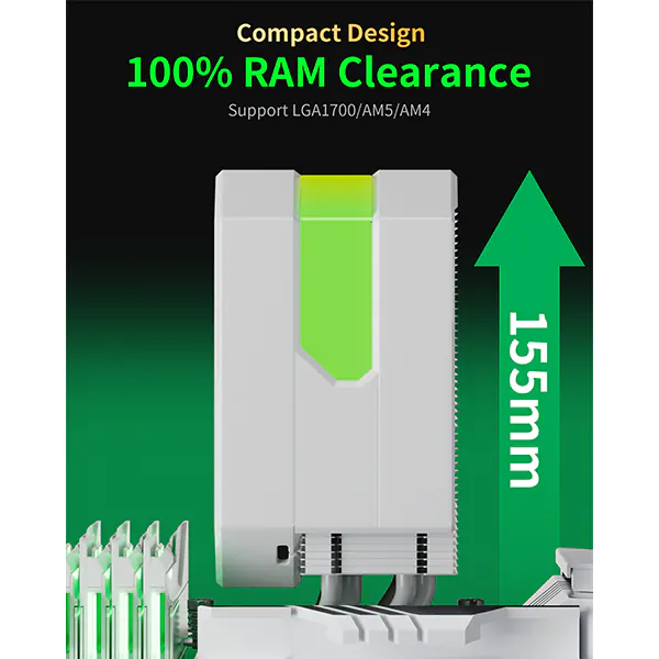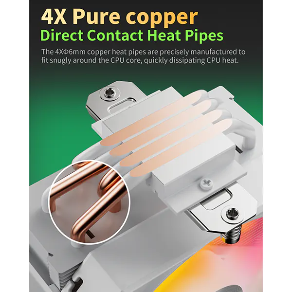 upHere UP1TC4C ARGB CPU Air Cooler – White is designed for efficient cooling with a compact size of 155 x 130 x 71 mm. It features a durable aluminum and copper cold plate measuring 40 x 35 mm for improved heat transfer. The heatsink is made of aluminum, ensuring effective heat dissipation. The cooler has four copper heat pipes, providing a cooling capacity of up to 230W. This helps in maintaining stable temperatures during high-performance computing.