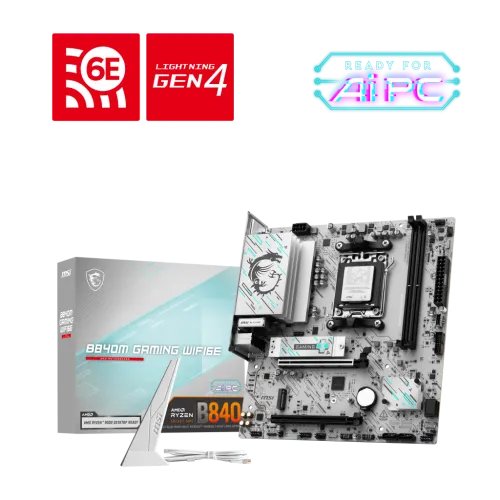 The MSI B840M GAMING WIFI6E AM5 mATX Motherboard is built for powerful gaming, smooth multitasking, and next-gen performance. This motherboard supports the latest AMD Ryzen 9000, 8000, and 7000 Series Desktop Processors. It uses the advanced AM5 socket and is based on the AMD B840 chipset. This combination ensures high compatibility and strong system performance.The MSI B840M GAMING WIFI6E Motherboard features dual DDR5 UDIMM slots, supporting up to 128GB of high-speed memory. It supports memory speeds from DDR5 4800 MT/s up to 8000+ MT/s (OC), depending on the CPU model. It is compatible with AMD EXPO, JEDEC standard, dual-channel architecture, and non-ECC, un-buffered modules. It also supports clock driver bypass mode for enhanced memory control and reliability.For graphics, it includes 1x HDMI 2.1 port and 1x DisplayPort 1.4, both supporting 4K resolution at 60Hz. This allows ultra-clear visuals for gaming, streaming, and content editing. The integrated Realtek ALC897 codec provides 7.1-channel high-definition audio, delivering immersive sound for gaming and entertainment.The MSI B840M GAMING WIFI6E motherboard comes with two PCIe x16 expansion slots. The primary PCI_E1 slot supports PCIe 4.0 x16, ideal for high-end GPUs. The second PCI_E2 slot offers PCIe 3.0 x4, suitable for additional cards. PCIe lane support varies by CPU, offering flexible options for Ryzen 9000, 8000, and 7000 processors.For fast storage, the B840M offers 2x M.2 PCIe 4.0 x4 slots, both supporting 2280/2260 SSDs. Additionally, it features 4x SATA 6Gbps ports with support for RAID 0, 1, and 10, allowing improved data protection and performance.It includes Realtek 8125D 2.5G LAN for fast and stable wired connections. For wireless users, it comes with Wi-Fi 6E pre-installed in the M.2 (Key-E) slot. It supports 2.4GHz, 5GHz, and 6GHz bands with speeds up to 2.4Gbps, along with Bluetooth 5.3 for seamless wireless device connections.It offers 2x USB 2.0 (rear) and 4x USB 2.0 (front) ports. For faster data transfer, it includes 4x USB 5Gbps Type-A (rear), 2x USB 5Gbps Type-A (front), and 1x USB 5Gbps Type-C (front). It also provides several internal headers, including RGB, ARGB, fan, TPM, and audio connectors.The B840M GAMING WIFI6E features multiple EZ Debug LEDs and EZ Memory Detection LED for easy troubleshooting. It also includes headers for RGB lighting and addressable RGB effects, making it ideal for building visually appealing gaming PCs.With a micro-ATX form factor (226mm x 243.84mm), it fits in smaller cases while still offering top-tier performance. This form factor is perfect for gamers and creators looking to build compact but capable systems.The MSI B840M GAMING WIFI6E AM5 motherboard is a solid choice for users seeking speed, stability, and modern features. It delivers advanced memory support, high-speed connectivity, and superior audio and graphics options. It’s ideal for both casual builders and serious gamers who want a compact yet powerful AM5 motherboard.