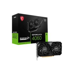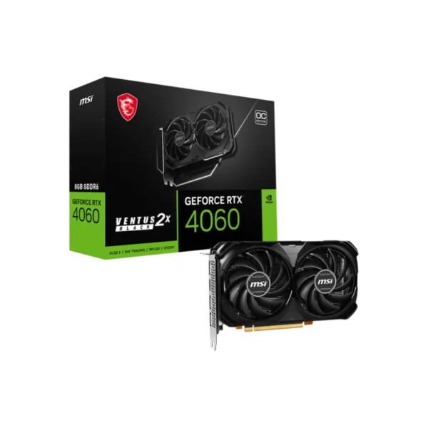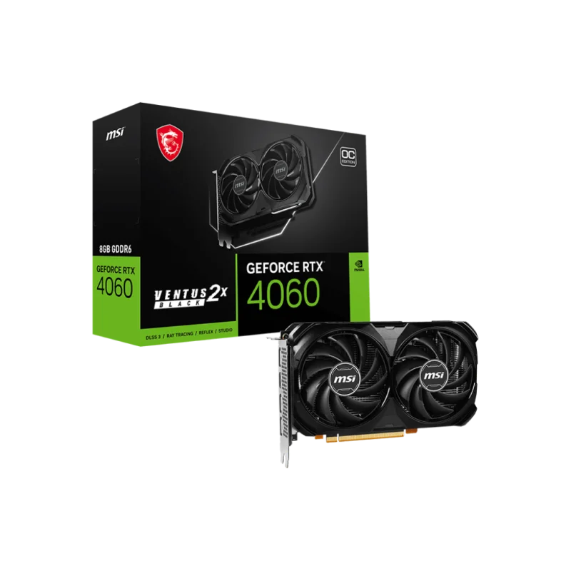 The MSI GeForce RTX 4060 VENTUS 2X BLACK 8GB OC GDDR6 Graphics Card is a high-performance graphics card designed for gaming, streaming, and creative tasks. Powered by the NVIDIA Ada Lovelace architecture, it delivers efficient performance and supports advanced features like ray tracing and DLSS 3 for enhanced gaming experiences. Additionally, it provides productivity boosts with NVIDIA Studio. The graphics card boasts a sleek and updated design with TORX FAN 4.0 technology, which ensures efficient cooling and allows the VENTUS to handle demanding tasks effortlessly. The TORX Fan 4.0 utilizes paired fan blades to generate focused air pressure, resulting in improved heat dissipation and temperature management. To further enhance cooling performance, the MSI GeForce RTX 4060 VENTUS 2X BLACK features Zero Frozr technology. This feature enables the fans to completely stop spinning when the temperatures are low, ensuring silent operation during less demanding tasks and minimizing noise. The graphics card is equipped with 8GB of GDDR6 memory and offers a memory speed of 17 Gbps, enabling smooth and fast rendering of graphics-intensive applications and games. It also provides a comprehensive selection of display options, including three DisplayPort 1.4a ports and an HDMI 2.1a port that supports 4K@120Hz HDR, 8K@60Hz HDR, and Variable Refresh Rate. The MSI Center is an exclusive utility that allows users to monitor, tweak, and optimize their MSI products in real time. It provides convenient control over the graphics card’s settings, allowing users to customize their gaming or creative experiences according to their preferences. The MSI GeForce RTX 4060 VENTUS 2X BLACK 8GB OC GDDR6 Graphics Card is a reliable and powerful option for gamers, streamers, and content creators who seek exceptional performance, efficient cooling, and advanced features for their computing needs.