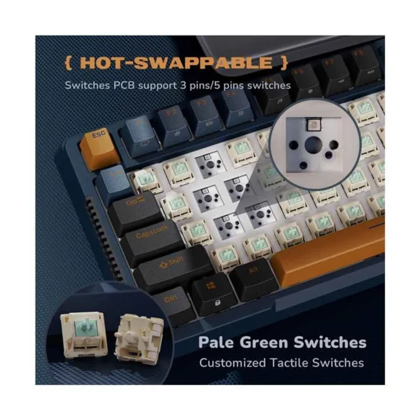The Royal Kludge RK H81 RGB Tri-Mode Hot-Swappable Brown Switch Mechanical Keyboard offers a diverse set of functions designed for both productivity and gaming fans. Users can easily tailor their experience to fit their tastes thanks to the game’s macro full-key programmability. With the lighting off, this keyboard can withstand up to 200 hours of continuous use, which guarantees long-lasting performance. A 3750mAh high-capacity battery offers longer usage for the Royal Kludge RK H81 RGB Tri-Mode Hot-Swappable Brown Switch Mechanical Keyboard, and the knob control adds to its practicality. The gasket-mounted construction of the Royal Kludge RK H81 RGB Mechanical Keyboard, along with the brown switches’ tactile feedback, guarantees comfortable typing. It is compatible with a wide range of devices and works with multiple operating systems, including Windows, Mac, iOS, and Android. It has multi-device connecting options, such as Bluetooth, USB, and a USB dongle. It meets both utilitarian and aesthetic needs with its 81 keys and vivid RGB lights. Its tri-mode capability also allows for effortless device switching across a wireless range of up to ten meters. To sum up, the Royal Kludge RK H81 Tri-Mode Mechanical Keyboard is a great option for anyone looking for a high-end mechanical keyboard because of its exceptional performance, durability, and versatility.