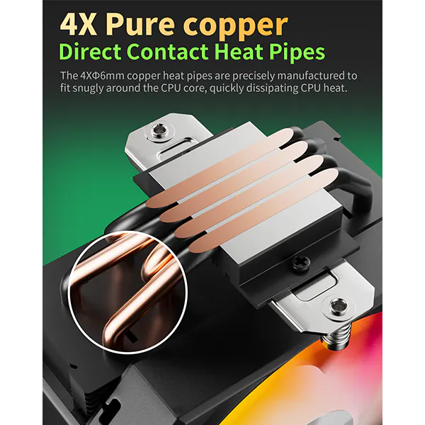 upHere UP1KC4C ARGB CPU Air Cooler – Black is designed for efficient cooling with a compact size of 155 x 130 x 71 mm. It features a durable aluminum and copper cold plate measuring 40 x 35 mm for improved heat transfer. The heatsink is made of aluminum, ensuring effective heat dissipation. The cooler has four copper heat pipes, providing a cooling capacity of up to 230W. This helps in maintaining stable temperatures during high-performance computing.