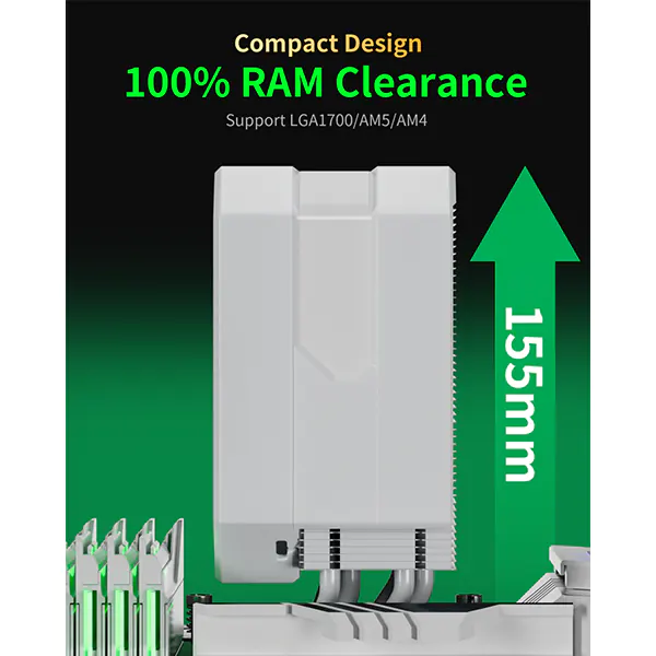 upHere UP1T4 CPU Air Cooler – White is designed for efficient cooling with a compact size of 155 x 130 x 71 mm. It features a durable aluminum and copper cold plate measuring 40 x 35 mm for improved heat transfer. The heatsink is made of aluminum, ensuring effective heat dissipation. The cooler has four copper heat pipes, providing a cooling capacity of up to 230W. This helps in maintaining stable temperatures during high-performance computing.