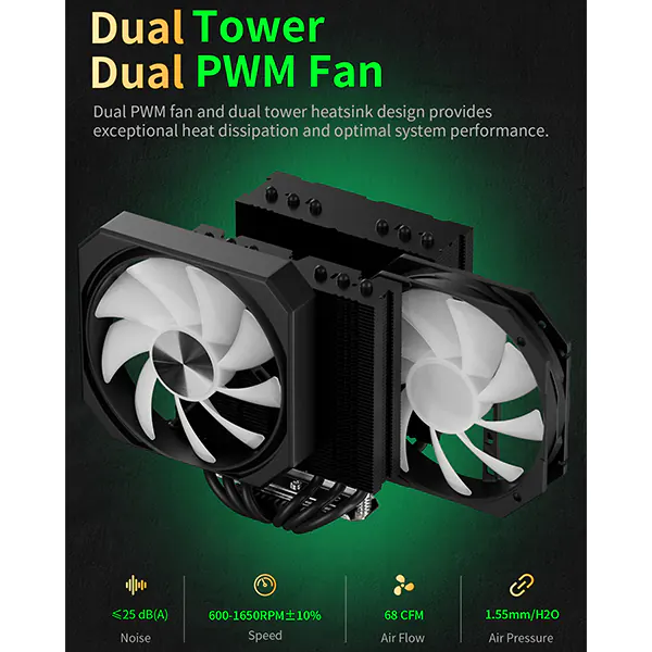 upHere UP2KC8C ARGB CPU Air Cooler – Black is a high-performance cooling solution designed for powerful processors. It features eight copper heat pipes and a dual-fan setup, ensuring efficient heat dissipation and stable performance. With dimensions of 158 x 130 x 122 mm, this air cooler includes a cold plate made of aluminum and copper, measuring 40 x 35 mm. The heatsink is made of aluminum, helping to improve heat transfer. The eight copper heat pipes handle up to 280W TDP, making this cooler suitable for demanding applications and overclocked systems.